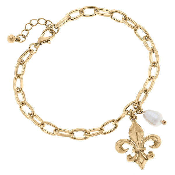 Robin Bourbon Fleur de Lis & Pearl Charm Chain Bracelet in Worn Gold