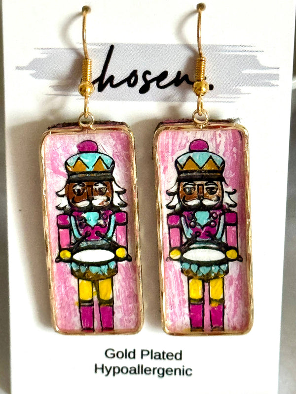 Nutcracker Hand Painted Leather Earring Collection: Pink-Dark Skin Tone-Gold plated frames and hooks
